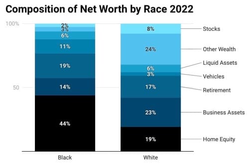 The composition of that wealth matters too. Black families hold roughly 43% of their wealth in home equity. By contrast, white families hold only 19% in home equity—the rest is spread across stocks, business assets, and other investments. When the 2008 financial crisis hit, Black families lost a disproportionately catastrophic share of everything they had, because what they had was mostly in housing. White families, holding more stock-based wealth, bounced back faster when the market recovered. One crisis. Two completely different experiences of it.