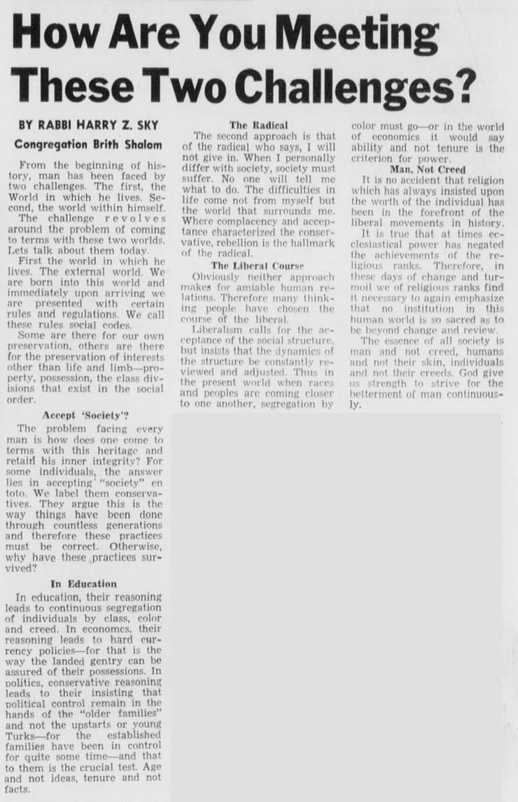 In 1956, a rabbi named Harry Z. Sky took the pulpit at Congregation Brith Shalom.