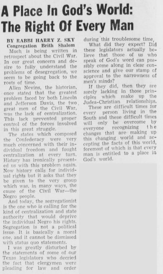 Into this context, Rabbi Harry Z. Sky began writing a regular column for the local newspaper, The Bellaire Texan. Not everyone in his community was pleased.