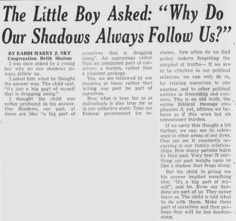 By May 1958, he was writing about the weight of the past itself. The column began with a young boy who asked his father why shadows always follow us. Rabbi Sky used the question to argue that communities, like people, are followed by their histories whether they acknowledge them or not. The shadow of segregation, of inherited inequality, of collective moral failure—these don't disappear when you move to a nice suburb. They follow you there. He connected it directly to the way federal power and individual rights were being debated in the context of integration and to the tendency of comfortable people to treat their past as someone else's problem.