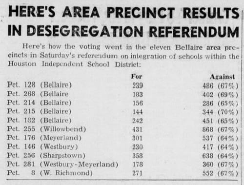 When Bellaire residents were asked directly in a 1960 referendum on desegregation within HISD, they answered clearly: in every single Bellaire precinct, roughly two thirds voted against integration. The quiet suburb had a clear opinion. It just preferred not to say it out loud.