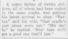 “A negro father of twelve children, all of whom had been rocked in the same cradle, was putting his latest arrival to sleep. ‘Rastus,’ said his wife, ‘that cradle’s just about wore out.’ ‘‘Hit sho’ is,’ he replied. ‘Nex’ time we’ll get a good one that’ll last.’