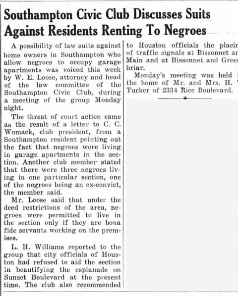 Local civic associations enforced these norms with vigilance. In nearby Rice Village, for example, the Southampton Civic Club in 1947 threatened legal action against residents who were renting their homes to Black tenants in violation of the neighborhood’s deed restrictions.