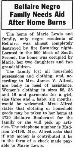 In Bellaire, the only evidence of a Black resident during this time period is Marie Lewis, who lived with her two daughters and two grandchildren until her house burned down in March 1947.