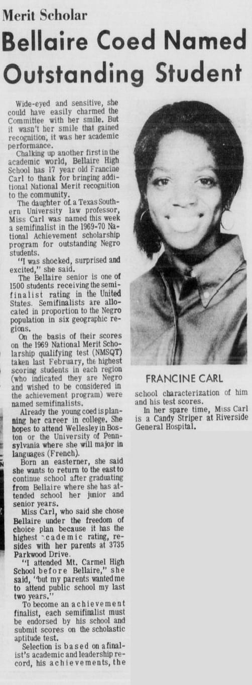 In 1969, a Bellaire senior named Francine Carl became one of 1,500 students nationwide to reach semifinalist ranking in the National Merit Scholarship program. She was also named a National Achievement semifinalist, a program recognizing outstanding Black students. Carl was seventeen years old and planning to study law.