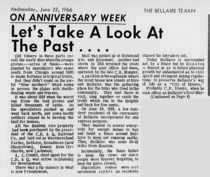 By 1918, Bellaire had about 200 residents and a problem that is, in retrospect, a perfect metaphor for everything that came after: the cattle. Because the surrounding Rice Ranch land was unincorporated open range, local ranchers let their livestock roam freely—which meant that cows wandered through Bellaire's residential streets, trampled gardens, and decorated sidewalks in ways that offended the sensibilities of a community that had come a long way to build something refined. The residents' solution was to incorporate as a city on June 24, 1918—not for any grand civic purpose, but to gain the legal authority to tax themselves and use that money to build a fence around the entire town. Bellaire's first act of self-governance was to “build a wall.”