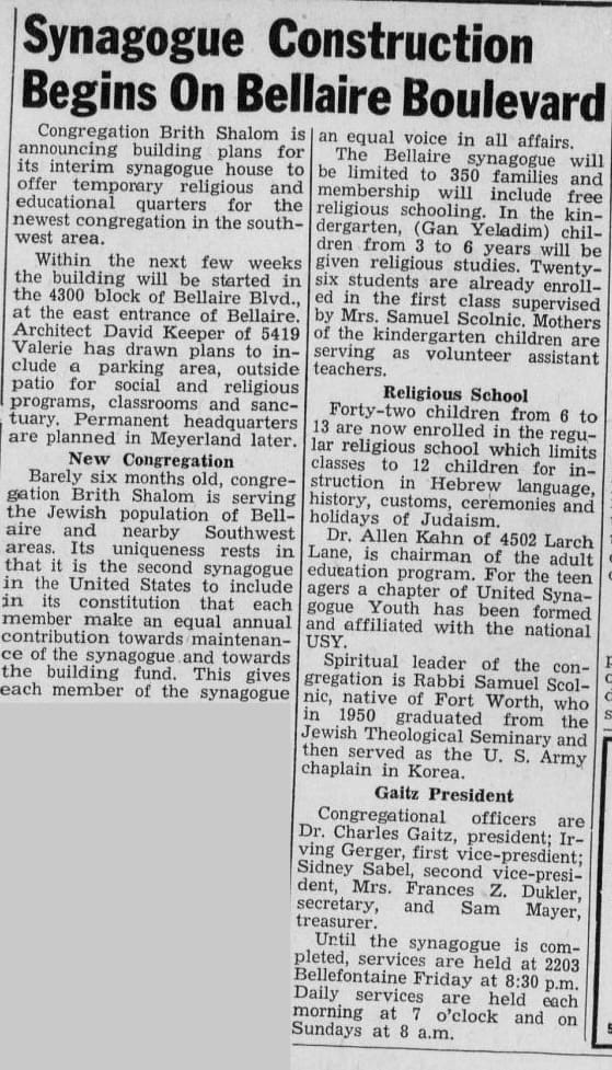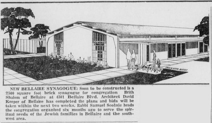 The story of that migration has a center of gravity: Congregation Brith Shalom. It started with a meeting in September 1954: what do Jewish families in Southwest Houston actually need? A place to pray, a Hebrew school, a community close enough to walk to. By 1955 they had a rented house, a constitution, and a name—Brith Shalom, covenant of peace—and were holding their first High Holy Day services in a Knights of Columbus hall. By March 1956 they had moved into their own building—a prefabricated structure that the members had physically helped to construct. Three years later they had outgrown it. In the fall of 1959 they purchased the First Baptist Church that stood at their current location, and dedicated the building in April 1961.